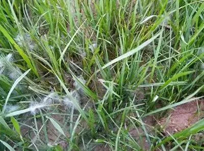 腐霉枯萎病也叫綿腐病、絮狀疫病、油斑病等。其典型的特征是在早晨有露水或大雨過后的清晨,草坪病株上離地2至3厘米處可見一層絨毛狀的白菌絲,干燥后菌絲體消失,葉片枯萎失水后變成干稻草色,形成一個個枯死圈。如果持續(xù)多日高溫高濕,此病會迅速蔓延,危及整塊草坪。